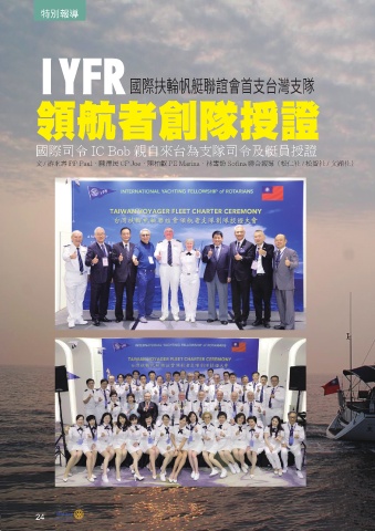 特別報導 IYFR 國際扶輪帆艇聯誼會首支台灣支隊 領航者創隊授證 國際司令 IC Bob 親自來台為支隊司令及艇員授證 文 / 游永壽 PP Paul.陳澤民 CP Joe.陳柏叡 PE Marina.林雪馚 Sofina 聯合報導(松仁社 / 松智社 / 文湖社) 24 24