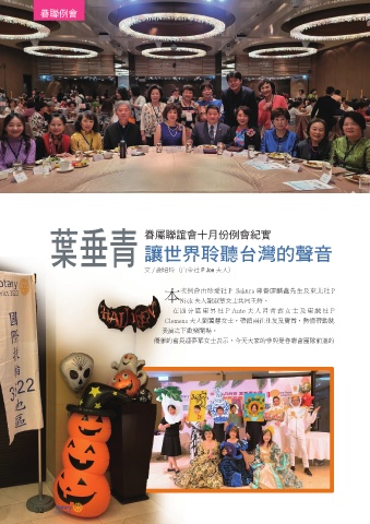 眷聯例會 葉垂青 眷屬聯誼會十月份例會紀實 讓世界聆聽台灣的聲音 文 / 謝培玲(白金社 P Joe 夫人) 本 次例會由珍愛社 P Sakura 尊眷廖麟鑫先生及東北社 P Nick 夫人謝淑華女士共同主持。 在四分區 東昇社 P Auto 夫人呂青 蓉女士及東誠社 P Clemens 夫人劉翼慧女士,帶領兩社社友及寶眷,熱情帶動跳 表演之下歡樂開場。 優雅的會長連夢華女士表示,今天大家的參與是眷聯會團隊前進的 32 32