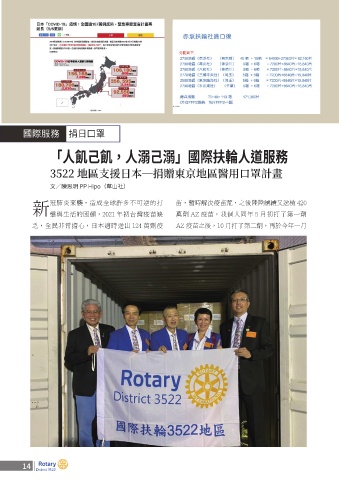 國際服務 捐日口罩 「人飢己飢,人溺己溺」國際扶輪人道服務 3522 地區支援日本—捐贈東京地區醫用口罩計畫 文/陳思明 PP Hipo(草山社) 新 冠肺炎來襲,造成全球許多不可逆的打 苗,暫時解決疫苗荒,之後陸陸續續又送檢 420 萬劑 AZ 疫苗,我個人同年 5 月初打了第一劑 擊與生活的困頓,2021 年初台灣疫苗缺 乏,全民非常擔心,日本適時送出 124 萬劑疫 AZ 疫苗之後,10 月打了第二劑,再於今年一月 14 總監月報 2 月號 15 14