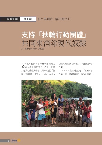 扶輪知識 二月主題 和平與預防 / 解決衝突月 支持「扶輪行動團體」 共同來消除現代奴隸 文/陳思明 PP Hipo(草山社) 月初,接到前全球獎學金受獎人 Group Against Slavery),向國際扶輪 2Mina 江玉敏的來信,希望我能協 提案。 助邀請台灣的扶輪社,共同來支持「扶 RAGAS 的提案摘要是:「鼓勵所有 輪 行 動 團 體 」RAGAS(Rotary Action 扶輪社員更了解嚴重的現代奴役的問題, 8 8 總監月報 2 月號 9