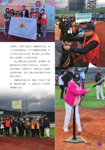 棒球場上,隨時可見和身心障礙球員年紀一樣 大小的同儕輔導員,亦步亦趨地跟著跑壘,和 孩子們成為彼此的依靠,相互攜手走到本壘終 點的人性燦爛,比冬陽更美更暖。 身心障礙兒童公益棒球賽,同時讓身心障 礙家庭亦得以走到戶外緊密交流,並參與孩子 成長的機會,場邊的爸爸、媽媽為孩子加油吶 喊的期盼身影,世界上還有什麽比親情的光輝 更為珍貴呢? 連續的低溫濕冷後,感謝上天送來冬日暖 陽。請記得有這麼一天,球場上留下了若熙熱 情滿滿的光影。 24 總監月報 No.12 25 25