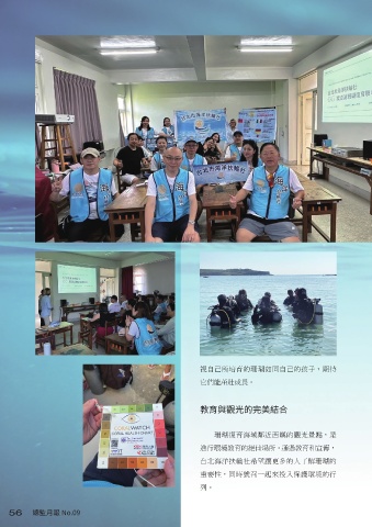 視自己所培育的珊瑚如同自己的孩子,期待 它們能茁壯成長。 教育與觀光的完美結合 珊瑚復育海域鄰近西嶼的觀光景點,是 進行環境教育的絕佳場所。通過教育和宣傳, 台北海洋扶輪社希望讓更多的人了解珊瑚的 重要性,同時號召一起來投入保護環境的行 列。 56 56 總監月報 No.09總監月報 No.09