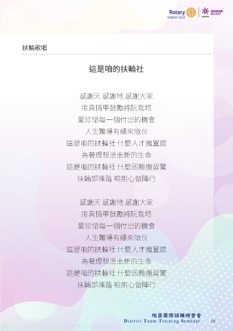 扶輪歌唱 這是咱的扶輪社 感謝天 感謝地 感謝大家 用真情甲鼓勵將阮栽培 愛珍惜每一個付出的機會 人生難得有緣來做伙 這是咱的扶輪社 什麼人才攏置遮 為著理想活出新的生命 這是咱的扶輪社 什麼困難攏毋驚 扶輪郅條路 咱用心做陣行 感謝天 感謝地 感謝大家 用真情甲鼓勵將阮栽培 愛珍惜每一個付出的機會 人生難得有緣來做伙 這是咱的扶輪社 什麼人才攏置遮 為著理想活出新的生命 這是咱的扶輪社 什麼困難攏毋驚 扶輪郅條路 咱用心做陣行 59