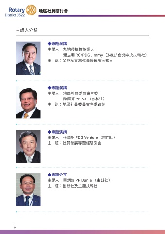 主講人介紹 ◆專題演講 主講人:九地帶扶輪協調人 賴志明 RC/PDG Jimmy(3481/ 台北中央扶輪社) 主 題:全球及台灣社員成長現況報告 ◆專題演講 主講人:地區社員委員會主委 陳國源 PP K.Y.(忠孝社) 主 題:地區社員委員會主委致詞 ◆專題演講 主講人:林華明 PDG Venture(東門社) 主 題:社員發展專題經驗引言 ◆專題分享 主講人:黃炳銘 PP Daniel(東誠社) 主 題:創新社及主題扶輪社 16 16